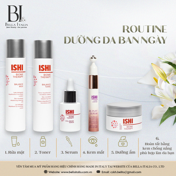 ISHI là thương hiệu mỹ phẩm dược sinh học, chuyên biệt dành cho làn da cần phục hồi sâu, nổi bật với dòng BiomeTherapy, hỗ trợ cân bằng hệ vi sinh da và tái tạo hàng rào bảo vệ tự nhiên, phù hợp cho da nhạy cảm, dễ kích ứng, da đang điều trị (laser, retinol, trị mụn...) với nhiều hoạt chất chức năng quý Acid Hyaluronic, vitamin B5, B3. Sản phẩm ISHI giúp chăm sóc da nhẹ nhàng, sâu từ bên trong, giúp làn da được phục hồi và tái tạo một cách bền vững.